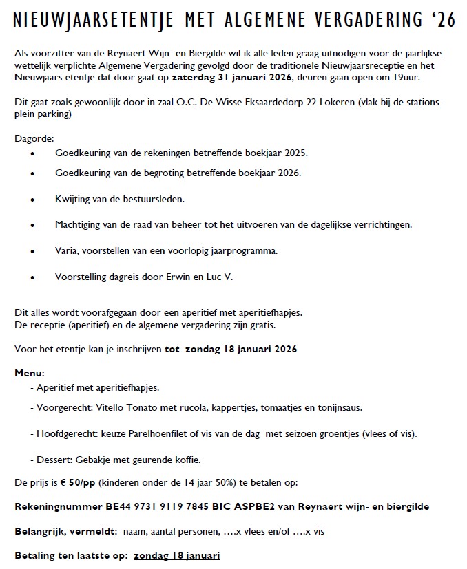 Juiste rekeningnaam Gilde: “Reynaert wijn- en biergilde” Gelieve als mededeling te noteren :